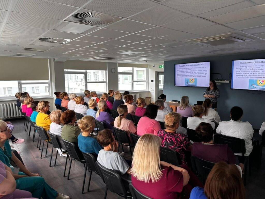 Помимо основной программы, в больнице была организована практическая лекция о значении гигиены рук, которую вела медицинская сестра по контролю за инфекциями Клинической университетской больницы имени Паула Страдиня Анна Каликова. В занятии приняли участие сестры-хозяйки и старшие медсестры ДРБ – они обсудили аспекты профилактики инфекций и принципы соблюдения гигиены рук в повседневной работе.