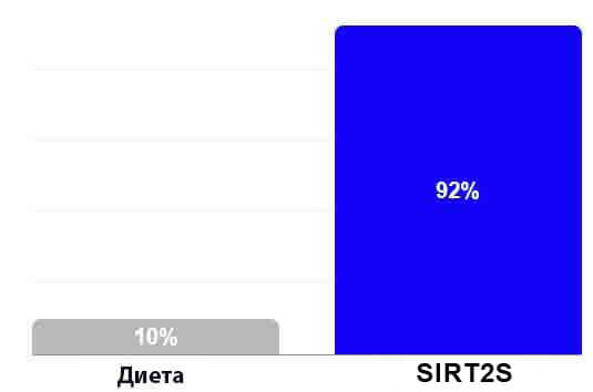 92% участников исследования, принимавших Sirt2S, потеряли более 17 кг в течение двух месяцев, в то время как только 10% людей добились этого с помощью традиционных методов похудения.