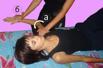 Вторая фаза: методист осторожно, насколько позволяет болевой синдром, отклоняет локоть книзу и фиксирует его в достигнутом положении (рис. 9б).