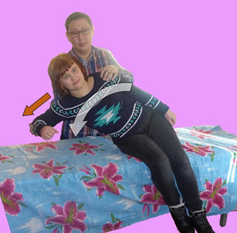 В последующем, когда эффект внезапности уже исчерпан, инструктор указывает сидящему больному область на поверхности кушетки в некотором расстоянии сбоку от его бедра со стороны тренируемой руки и наклоняет его корпус в эту сторону, побуждая пациента попасть локтем в намеченную точку. При повторении приёма «точка приземления» смещается всё дальше и дальше в сторону от больного (рис. 19).